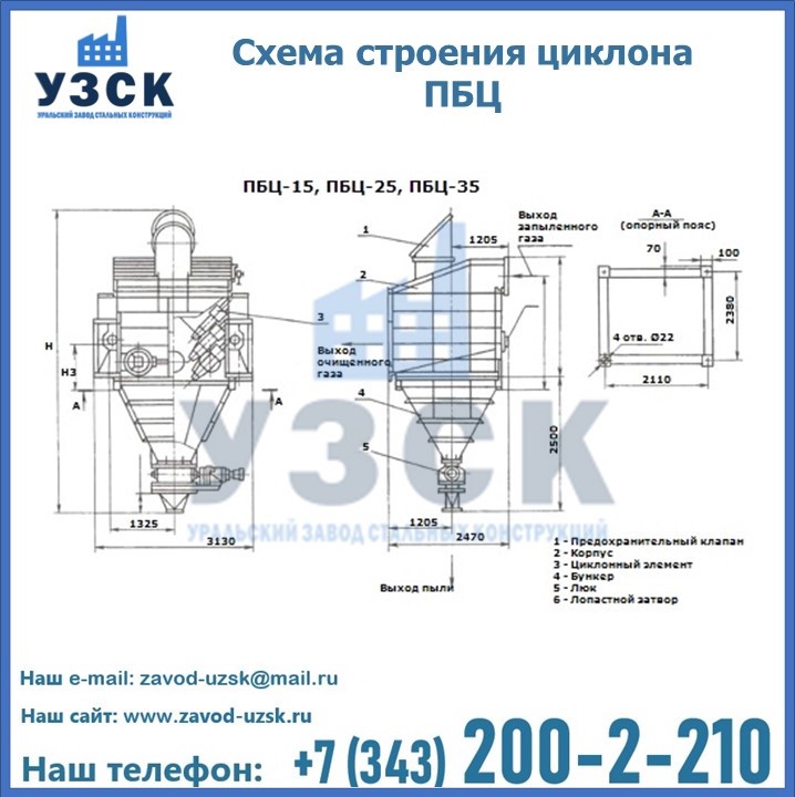 Завод «УЗСК» в Альметьевске предлагает приобрести циклоны ПБЦ и прочие устройства, полностью укомплектованные и готовые к эксплуатации. Мы гарантируем соответствие оборудования всем требованиям ГОСТ и ТУ, износостойкость и высокую производительность предлагаемого оборудования. Уральский Завод Стальных Конструкций изготавливает и продает надежное, эффективное и производительное оборудование, имеющее длительную гарантию и большой эксплуатационный ресурс. Если требуется изготовить циклон нестандартных размеров, то такой вариант выполнения заказа тоже предусмотрен, так как предприятие имеет собственные производственные площади и надежных поставщиков. На все поставляемое или производимое оборудование имеются чертежи и прочая техническая документация. Заказать и купить циклоны или прочее оборудование высокого качества и по доступной цене можно через наш сайт или по указанному в разделе «Контакты» телефону.