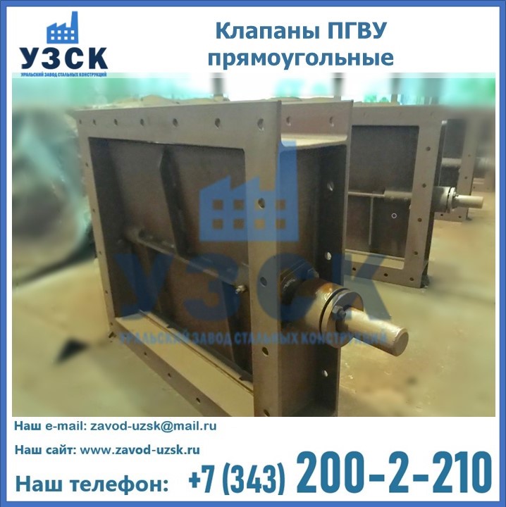 Прямоугольный клапан ПГВУ имеет прямоугольную или квадратную форму, по основному сечению конструкции, на которую устанавливается клапан. Для изготовления шиберов ПГВУ в Альметьевске применяются сталь нержавеющая, углеродистая или низколегированная, в зависимости от модели. Внутри клапана имеется запорный элемент, передвигающийся параллельно общему потоку движения среды. Запорный элемент, или створка имеет такую же форму, как и основное сечение. Перемещение створки происходит благодаря возвратно-поступательным движениям.